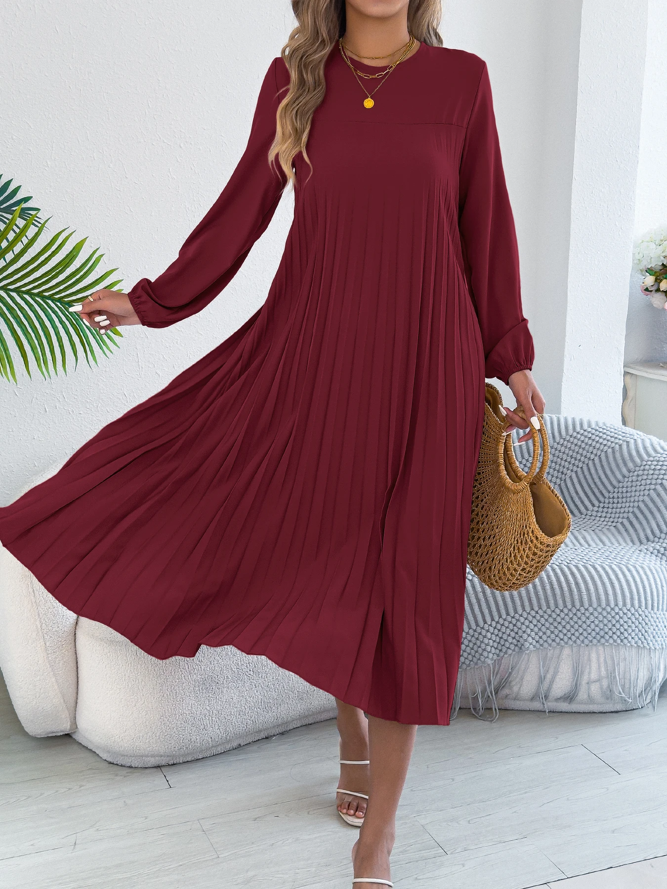 A gentle cascade of pleats shapes this autumn-ready dress, offering a soft, flowing silhouette that moves with ease. Round neck and long sleeves create understated sophistication. A versatile statement for cooler days, designed for elegance. Delicate pleating | Soft lining | Lightweight comfort | Relaxed fit