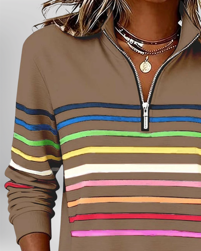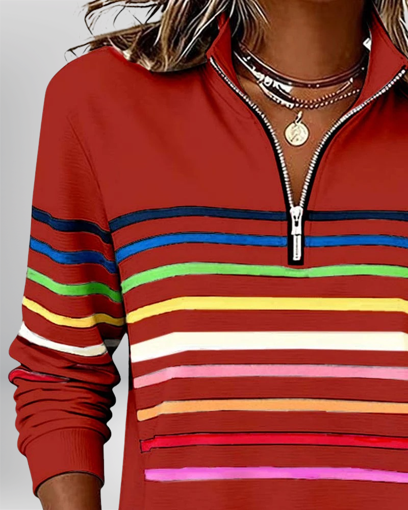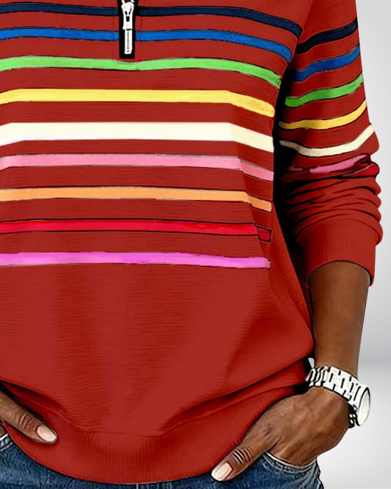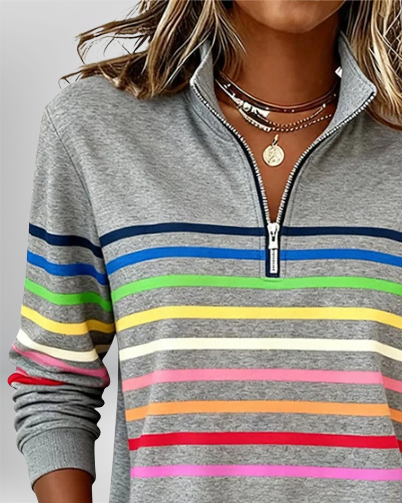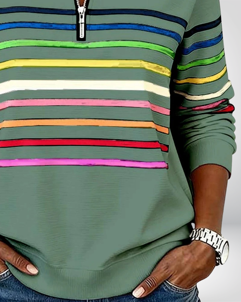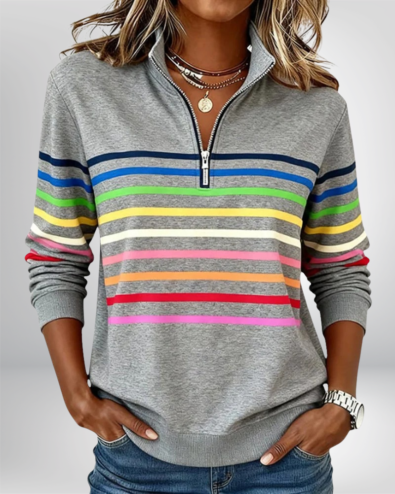 The Vienna Sweater is made for days when warmth should feel calm and easy to wear. Crafted from a cotton blend, it rests comfortably on the skin without feeling heavy or restrictive. The relaxed shape falls naturally, creating an easy fit that feels familiar throughout the day. A half-zip neckline adds gentle structure without drawing attention. The horizontal stripe pattern brings quiet visual detail while keeping the overall look balanced and composed.
